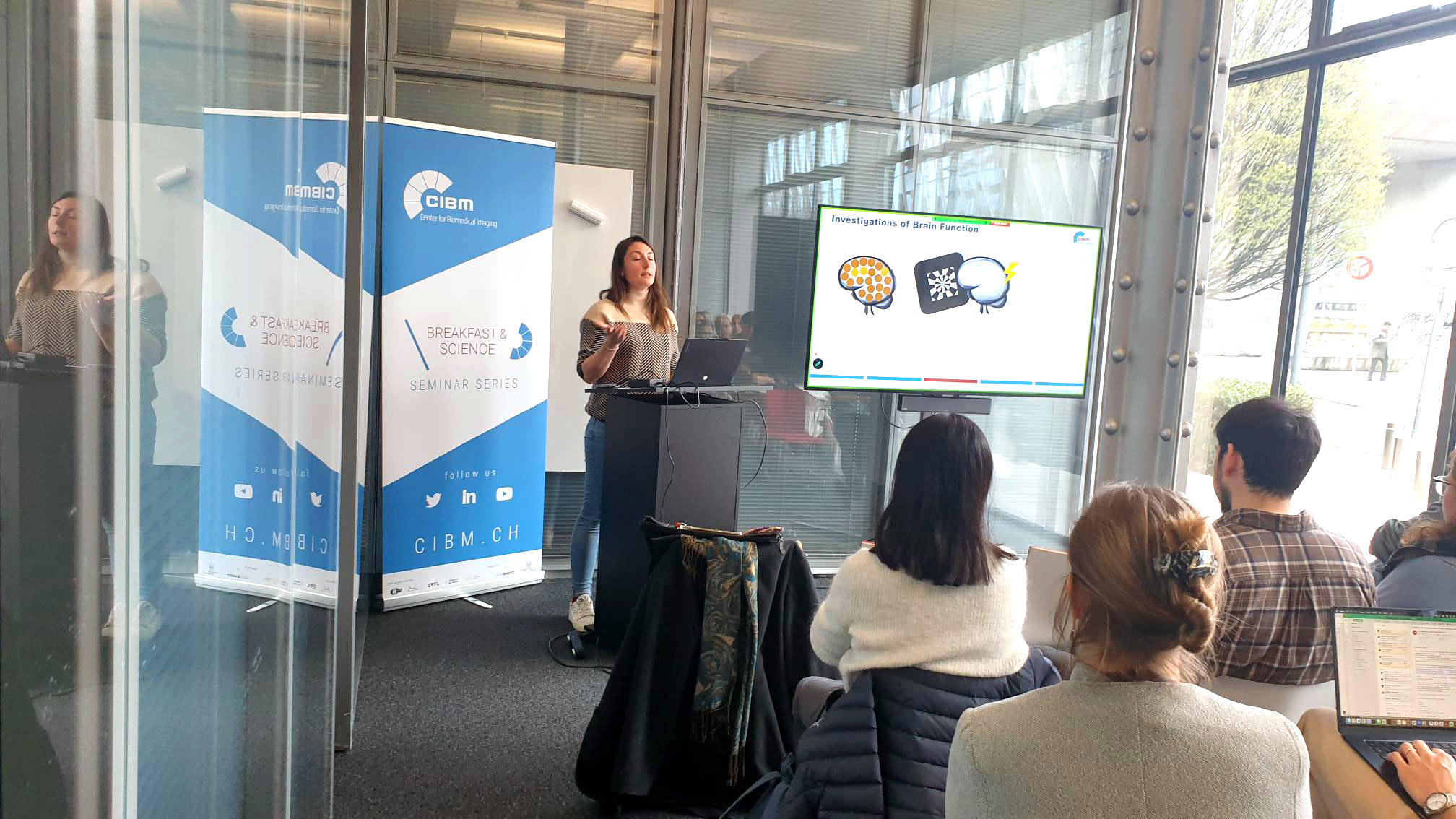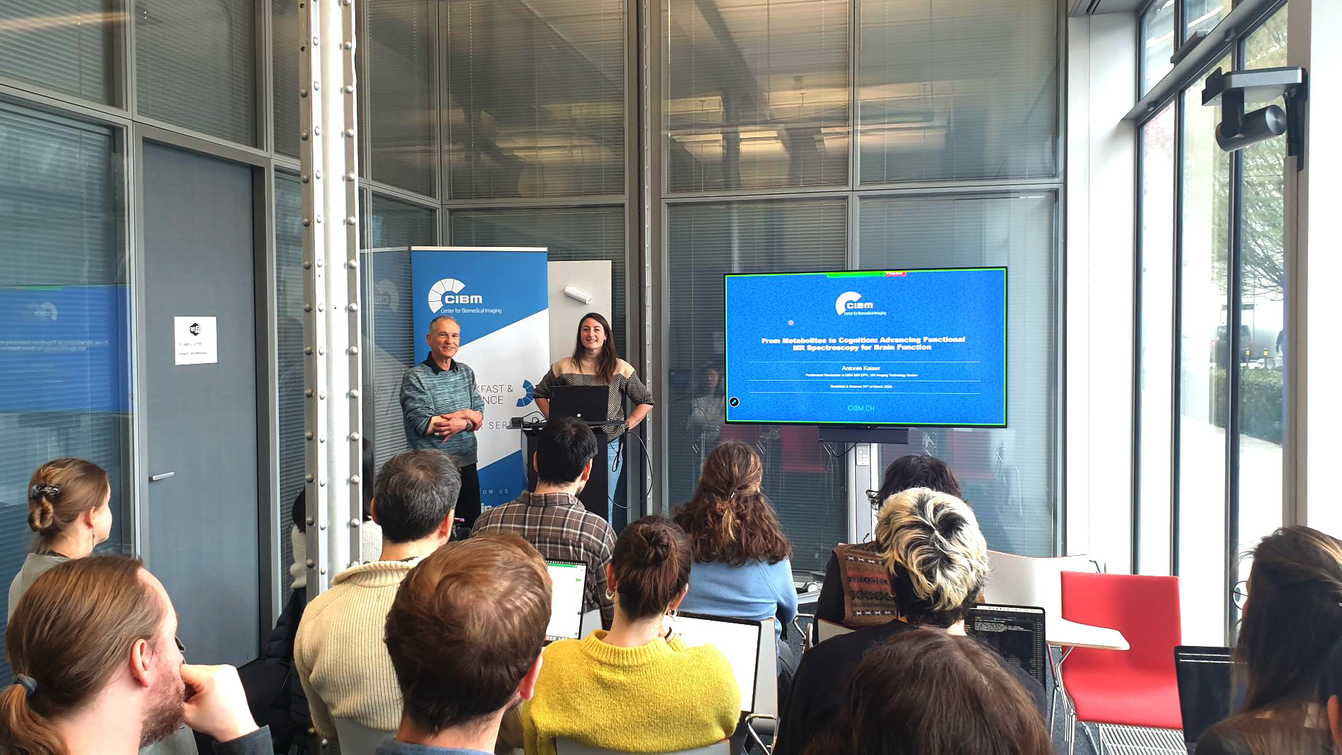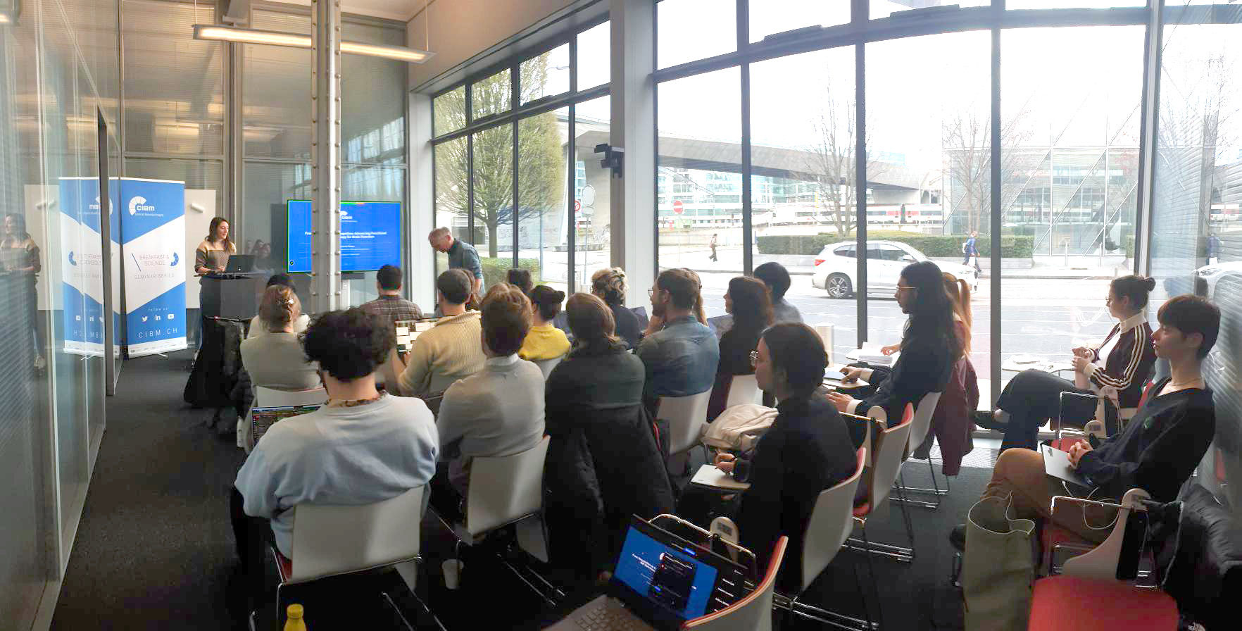 On March 31st, 2026, the 56th CIBM Breakfast & Science Seminar was presented by Antonia Kaiser from the CIBM MRI EPFL MR Imaging Technology Section. The event was chaired by Prof. Patrik Vuilleumier, Head of CIBM MRI UNIGE Cognitive and Affective Neuroimaging Section. The event took place at the Campus Biotech in Geneva with an engaged audience of around 50 participants both online and on site.