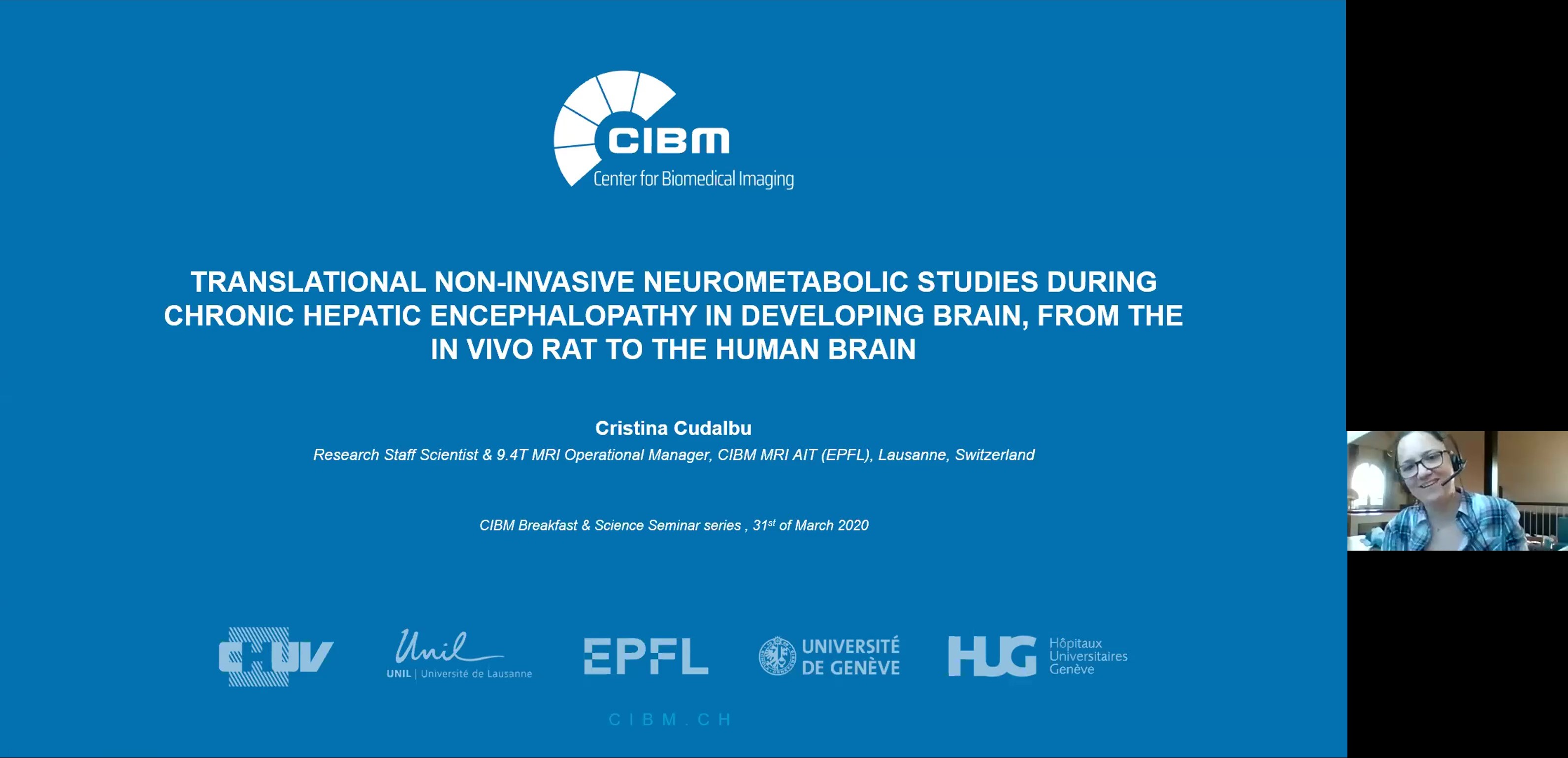 Indeed these were special circumstances for Breakfast and Science session, as mentioned by the first speaker Cristina Cudalbu, a research staff scientist and the 9.4T operational manager of the CIBM MRI EPFL Animal Imaging and Technology Section, who gave the talk entitled “Translational Non-Invasive Neurometabolic Studies during Chronic Hepatic Encephalopathy in Developing Brain, from the In vivo Rat to the Human Brain”, where she presented an exemplary collaborative work between all five CIBM founding partner institutions.