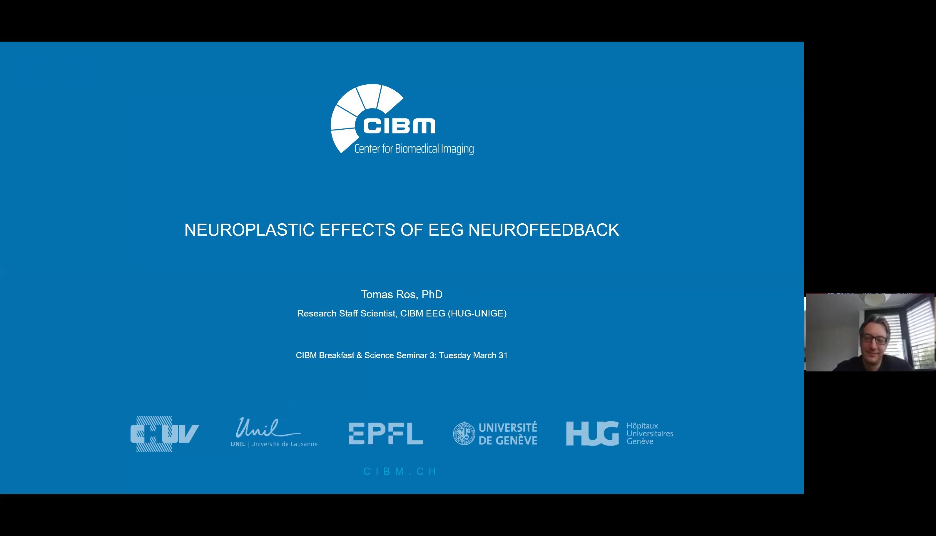 The second talk was by Tomas Ros, a research staff scientist from the CIBM EEG HUG-UNIGE Clinical and Translational Neuroimaging Section where he presented his work on “Neuroplastic effects of EEG neurofeedback” , a collaboration between Queen Square Institute of Neurology, University College of London, UK and General Psychiatry, University of Western Ontario, Canada.