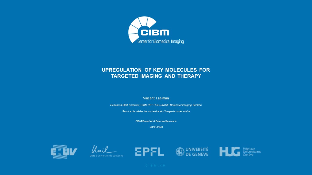 There was only one speaker, Vincent Taelman, a research staff scientist from the CIBM PET HUG-UNIGE Molecular Imaging Section who presented on “ Upregulation of Key Molecules for Targeted Imaging and Therapy”. Although the talk was mostly suited for molecular biologists, as described in abstract below,