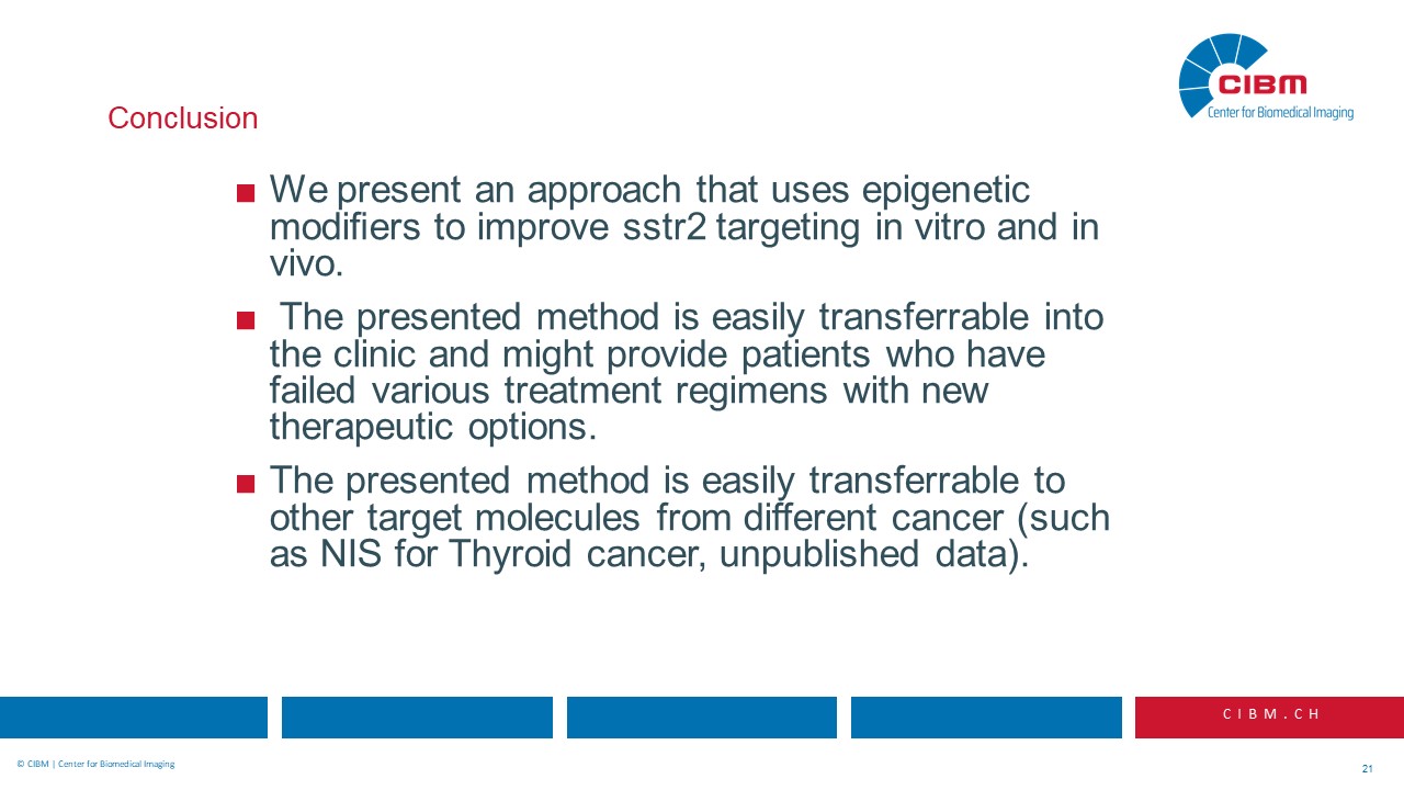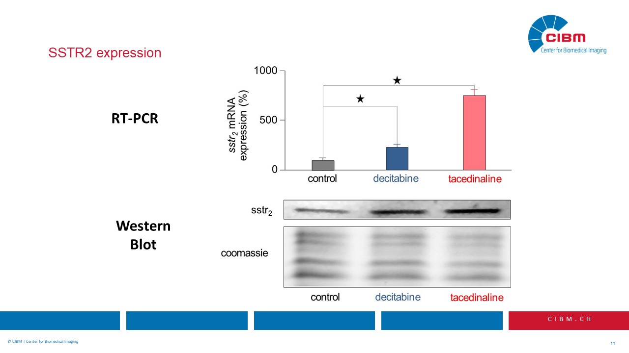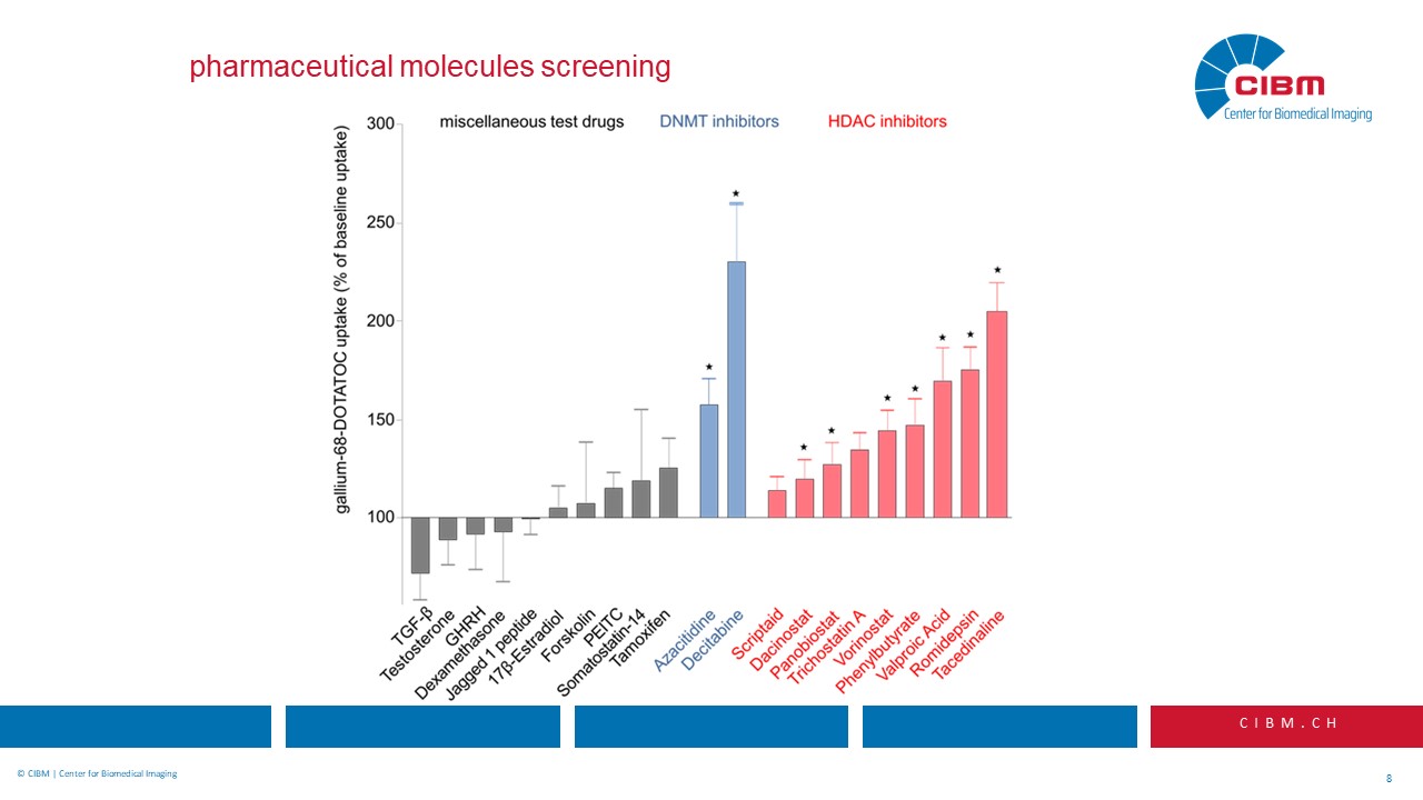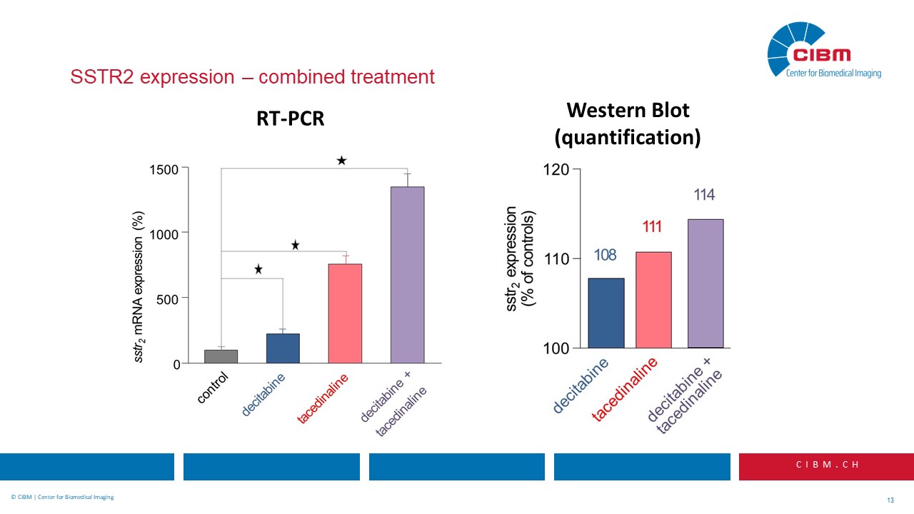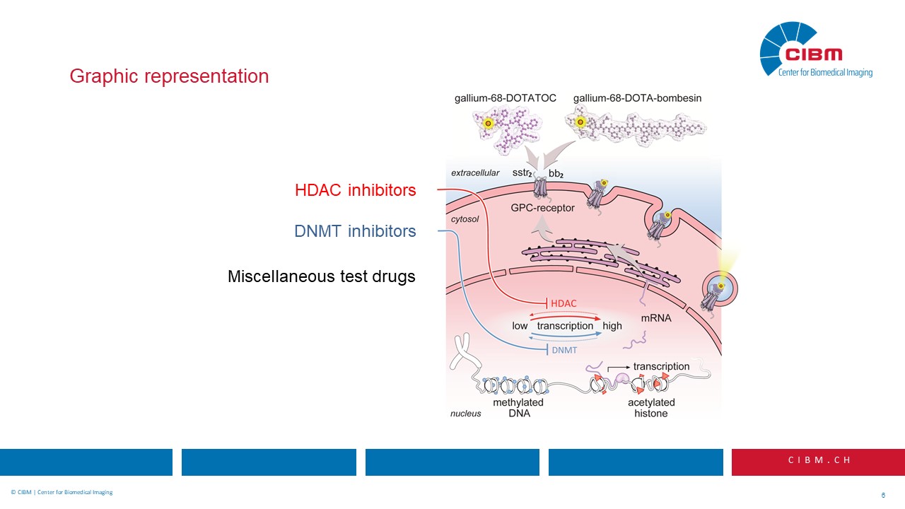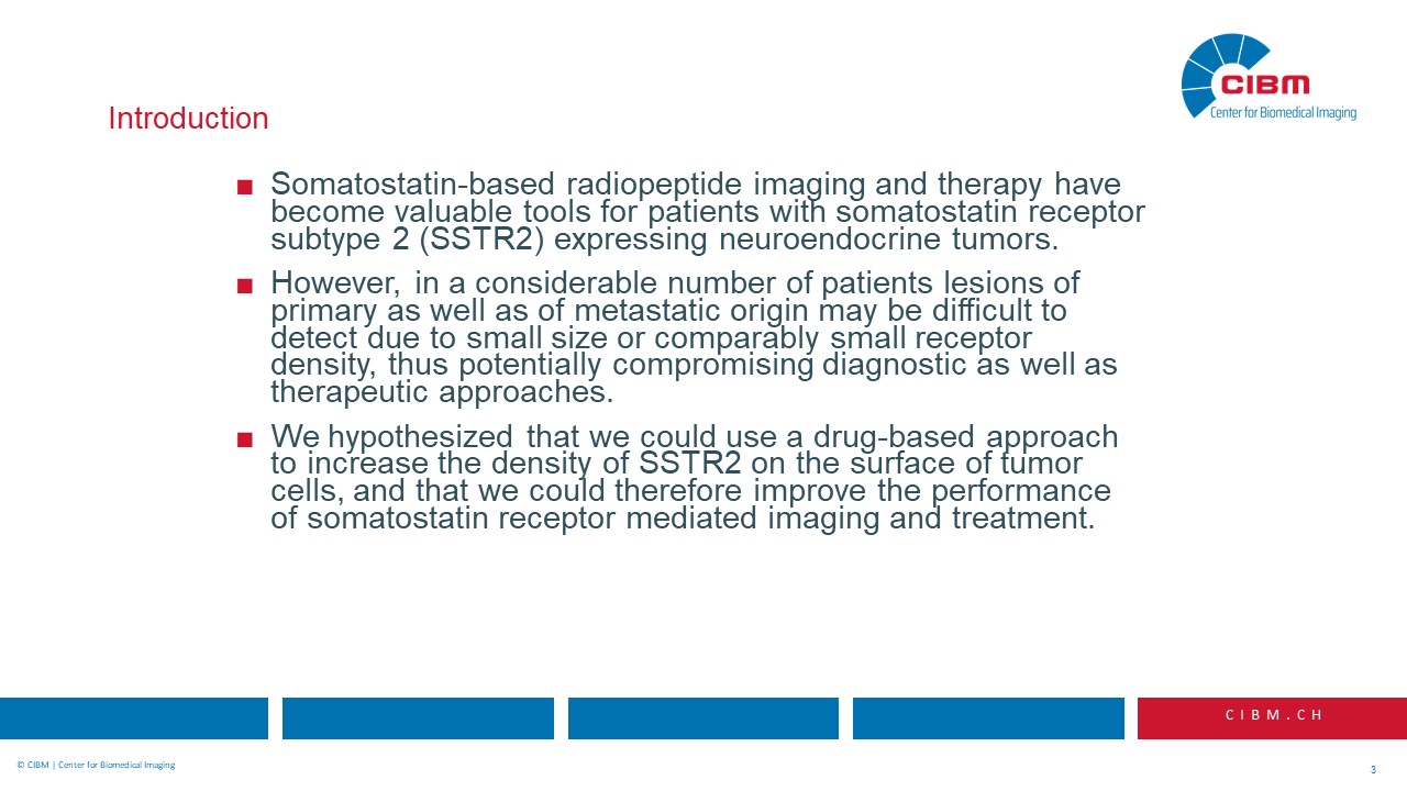 “Abstract: Somatostatin-based radiopeptide imaging and therapy have become valuable tools for patients with somatostatin receptor subtype 2 (SSTR2) expressing neuroendocrine tumors. However, in a considerable number of patients lesions of primary as well as of metastatic origin may be difficult to detect due to small size or comparably small receptor density, thus potentially compromising diagnostic as well as therapeutic approaches. We hypothesized that we could use a drug-based approach to increase the density of SSTR2 on the surface of tumor cells, and that we could therefore improve the performance of somatostatin receptor mediated imaging and treatment.”