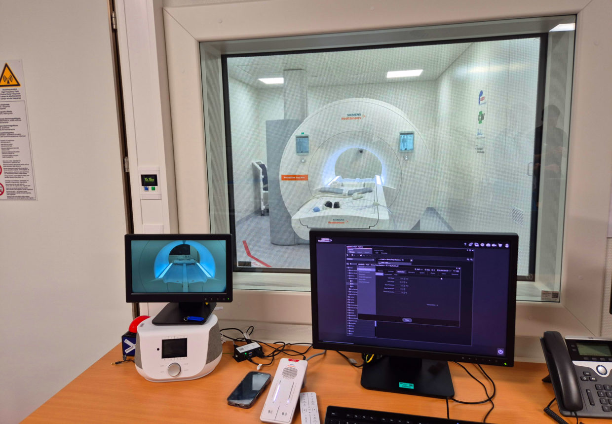 The group continued their visit to the CIBM’s facilities at the Department of Radiology at CHUV, where Eleonora Fornari and Jean-Baptiste Ledoux continued the student’s dive into the MRI technology. Dr. Fornari presented the principal research & clinical MRI system at CHUV, the 3T PrismaFit scanner where she carried out a brief demonstration of data collection of structural and functional MRI Mr. Ledoux demonstrated the new Free. Max 0.55T ultra low field MRI system.