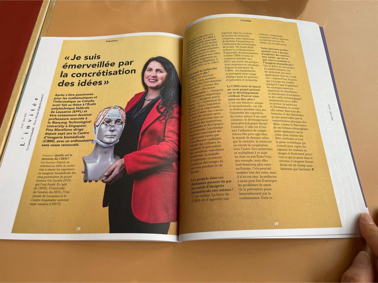 Pina Marziliano, CIBM Executive Director is the featured guest in L’invitée of the April-June 2026 issue of the Geneva University Hospital (HUG) Pulsations magazine , for an in-depth interview. She shares her international journey starting from her studies in mathematics and computer science in Canada, to her PhD at EPFL, and her time as an associate professor in Singapore.