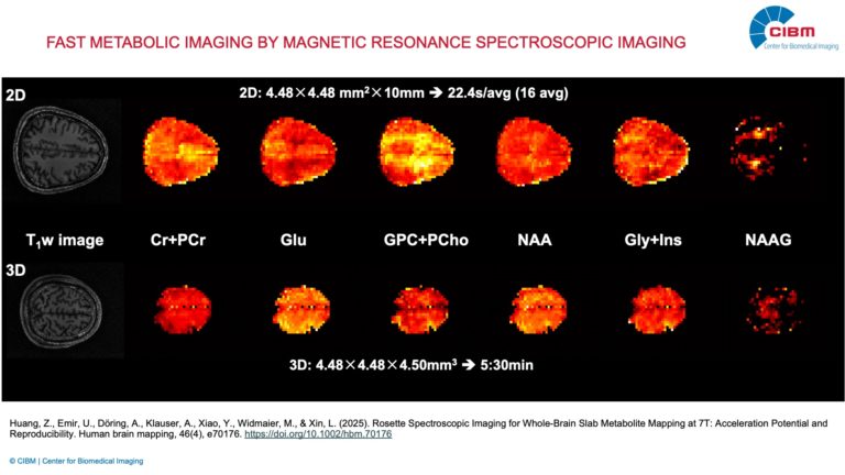 Description: Magnetic resonance spectroscopy (MRS) is a unique non-invasive technique to measure a variety of brain metabolites (e.g., N-acetylaspartate, creatines, choline, inositol) and certain neurotransmitters (glutamate, Gamma-Aminobutyric Acid). Functional MRS (fMRS) allows us to monitor the metabolites dynamics from rest to neuronal activation. However, so far it has remained mostly a single voxel technique with limited spatial and temporal resolution. By leveraging novel MR sequence designs (edited-MRSI, FID-MRSI), spatial encoding schemes (rosette trajectory), and reconstruction methods (compressed sensing) on a state-of-the-art 7T Terra.X MR scanner, the aim of this project is to improve spatial and temporal resolution to establish functional MR spectroscopic imaging (fMRSI) that enables the dynamic measurement of modulation patterns of neurotransmitter concentrations upon stimulation (sensory stimulations and cognitive tasks) in the human brain, and then mapping of brain metabolic connectivity.