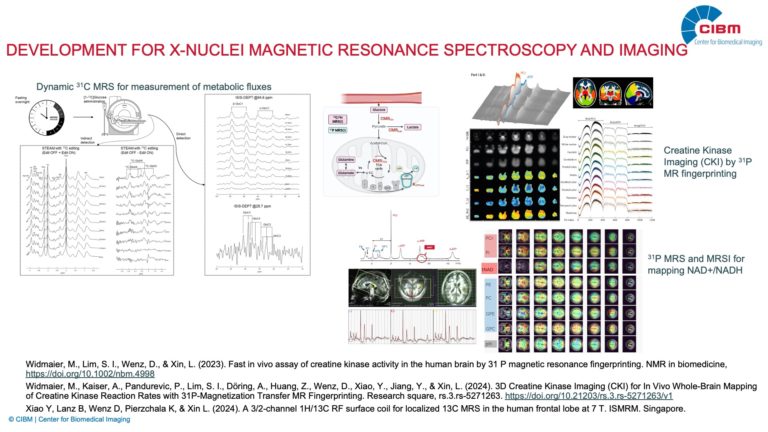 Our research focuses on innovation in multinuclear magnetic resonance methodologies for metabolic imaging in humans. We develop accelerated acquisition strategies and advanced reconstruction methods to reduce scan times for both static and dynamic mapping of metabolite levels at the clinical MRI platform. Additionally, we are establishing and expanding unique X-nuclei imaging capabilities for clinical applications, including 31P, 13C, and extending to 2H and other nuclei. Our human metabolic imaging research offers the following advanced methodologies: