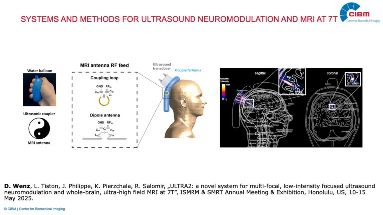High receive sensitivity is the holy grail of every magnetic resonance imaging (MRI) study. Our research aims to substantially boost receive sensitivity in different neuroimaging applications, accelerating total scan time and increasing spatial resolution. We develop innovative hardware concepts for the next generation of MRI detectors, particularly suitable for ultra-high field (UHF) MRI (B0 ≥ 7 T), focusing on unconventional transmit and receive radio frequency (RF) coil arrays involving strategies such as dipole antennas, dielectric resonators, and flexible loop coils. In addition, we explore new solutions for advanced, MRI-based techniques that can provide unique insights into the metabolism and function of the brain, such as phosphorus (31P) MR spectroscopy and electroencephalography combined with functional MRI (EEG/fMRI). Furthermore, we are working on highly promising, non-invasive human brain stimulation strategies. In particular, we develop hybrid hardware systems enabling transcranial low-intensity focused ultrasound (LIFU) neuromodulation combined with UHF-MRI, aiming at finding new ways to treat neurological and neuropsychiatric diseases.